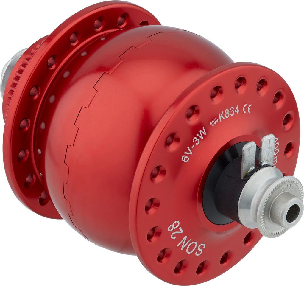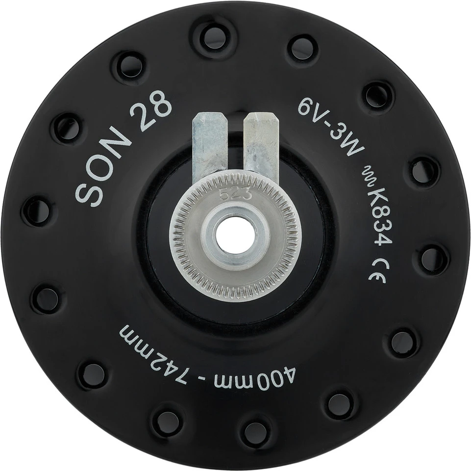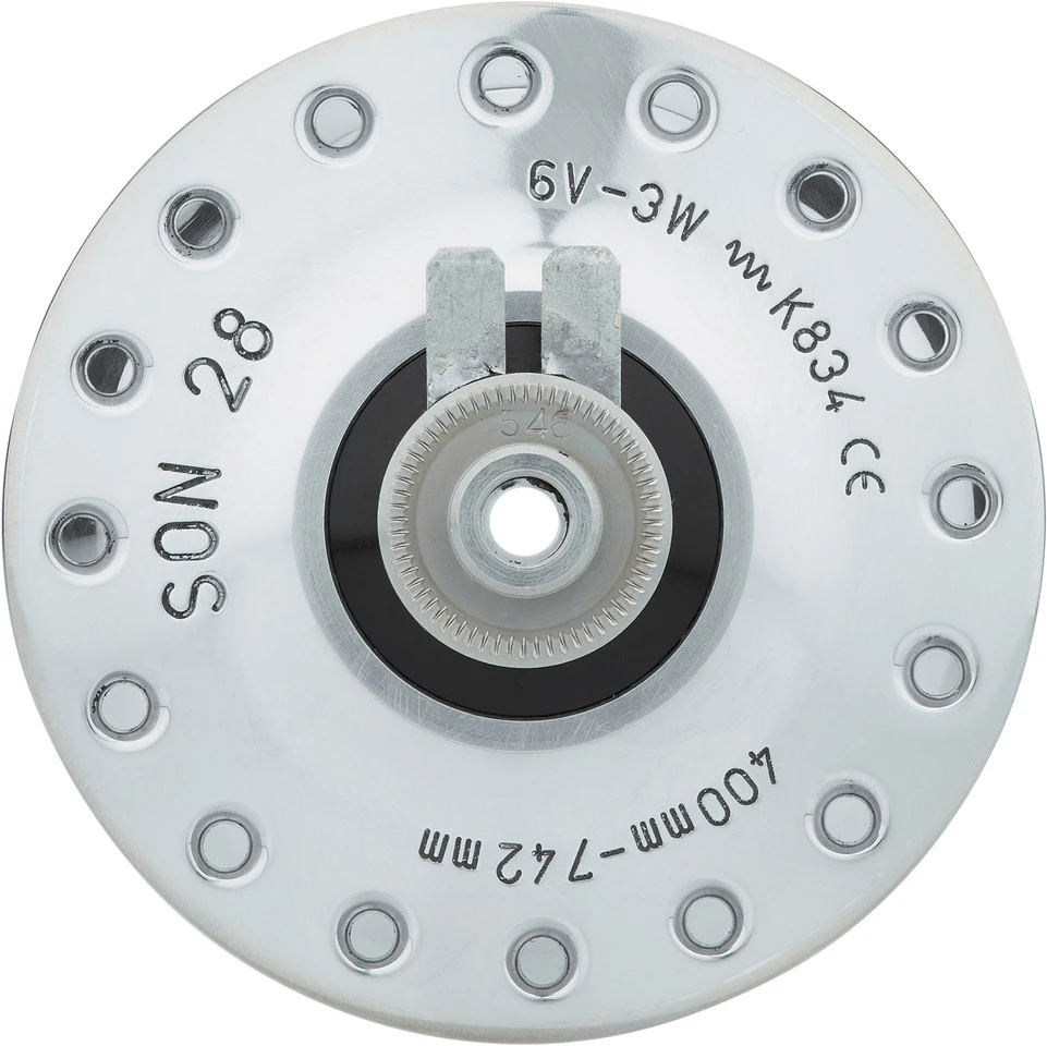 Der Son 28 ist ein universell für alle Laufradgrößen von 16″ bis 29″ zugelassener Nabendynamo. Die Nennleistung erreicht er im 28″ -Rad bei ca. 16 km/h. Damit ist er zu empfehlen, wenn bei langsamer Fahrt besonders viel Licht benötigt wird oder andere Geräte betrieben bzw. deren Akkus geladen werden sollen. Im Vergleich zum Vorgänger Son klassik konnten die Leerlaufverluste um ca. 15 % und das Gewicht um 140 g verringert werden.