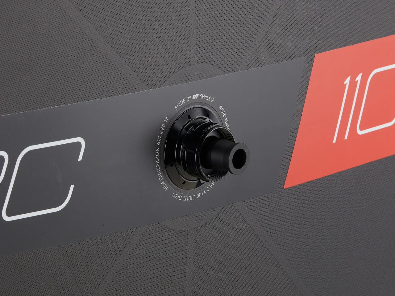 Das Scheibenlaufrad ist für 28 mm breite Reifen ausgelegt und wiegt lediglich 1100 g. Außerdem profitierst Du von einem deutlichen Segeleffekt. Auf der Antriebsseite ist das Rad flach, wodurch genug Platz für Dein Schaltwerk bleibt. Die Bremsseite hat eine leicht konvexe Form, wodurch die auftretenden Brems- und Antriebskräfte optimal verteilt werden. Die windschnittige 180 Nabe für Center-Lock-Bremsscheiben mit Ratchet EXP Zahnscheibenfreilauf sorgt zusätzlich für maximalen Vortrieb. Damit sich Deine Beinkraft ideal entfalten kann, hat der Freilauf 36 Zähne, die für eine direkte Kraftübertragung sorgen, wodurch unerwünschter Leertritt so gering wie möglich gehalten wird. Hinter einer Carbon-Kappe versteckt, findest Du das Ventilloch. Diese öffnest Du mit einer 90-Grad-Drehung ganz einfach ohne Werkzeug. Zur Sicherstellung der Aerodynamik schließt die Ventillochabdeckung nahtlos mit der Scheibenwand ab.
