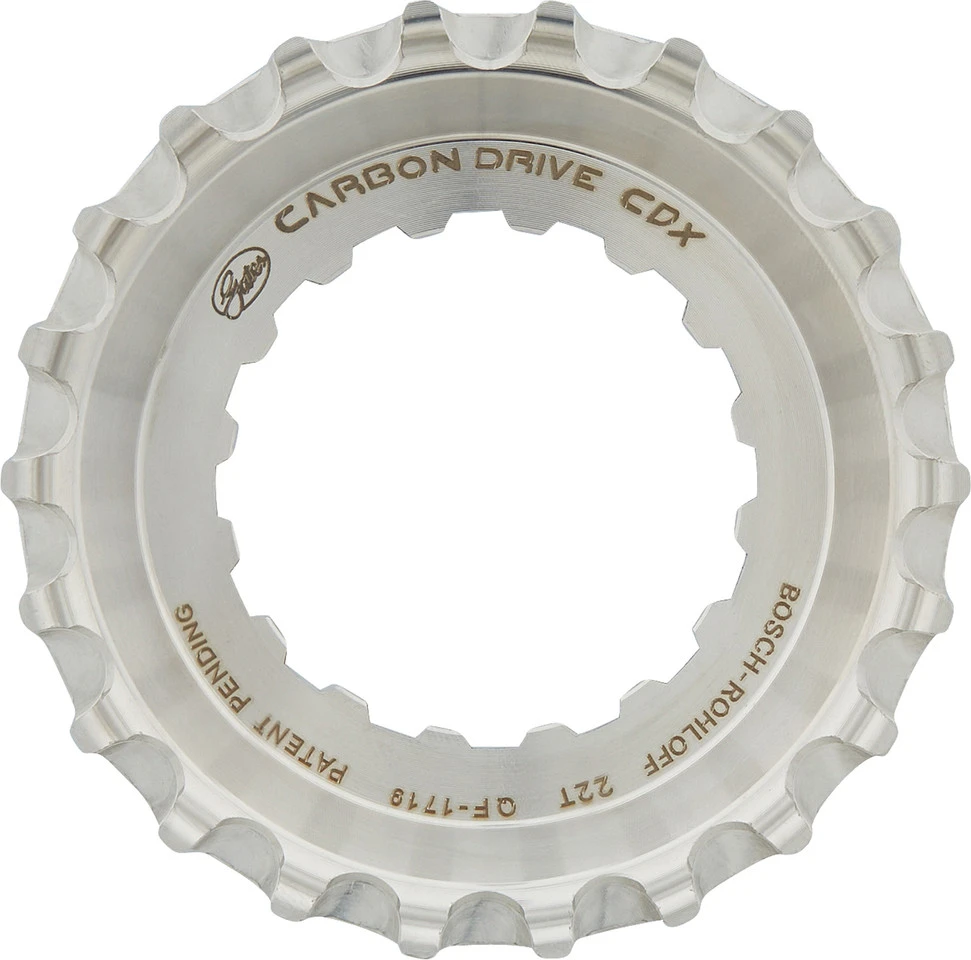 Spezifikationen:Einsatzbereich:Touring & Trekking, Cross Country, All MountainBefestigung:Direktaufnahme an Bosch Gen2-MittelmotorZähne:22 ZTechnische Daten:Breite der Zähne:11 mmZahnteilung:11 mmRiemenlinie:54,7 mmDicke der Riemenscheibe an der Aufnahme:4,5 mmVersatz:8,2 mm (Montagefläche), 6,0 mm (Mittellinie)Außendurchmesser:75,3 mmMaterial:EdelstahlKompatibilität:Bosch Gen2 Performance LineBosch Gen2 Performance Line CXnur geeignet für Rohloff Speedhub 500/14 mit 135 mm oder 142 mm Einbaubreite aufgrund der spezifischen KettenlinieVerwendung eines Snubber zwingend vorgeschrieben (verhindert ein Überspringen des Riemens)Features:CDX-Niveau: High-End-Variante für hohe Belastungen und beste Performancegeeignet für Schlamm, Sand, Schnee und Eis sowie sämtliche Straßenmittlere Führungsnut (CenterTrack)hohe Laufleistungrobuster EdelstahlTechnologie:Gates Carbon Drive System