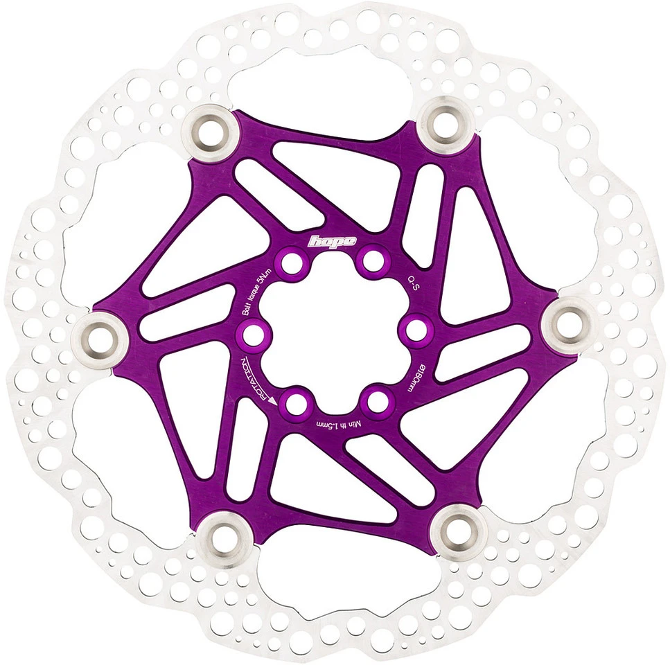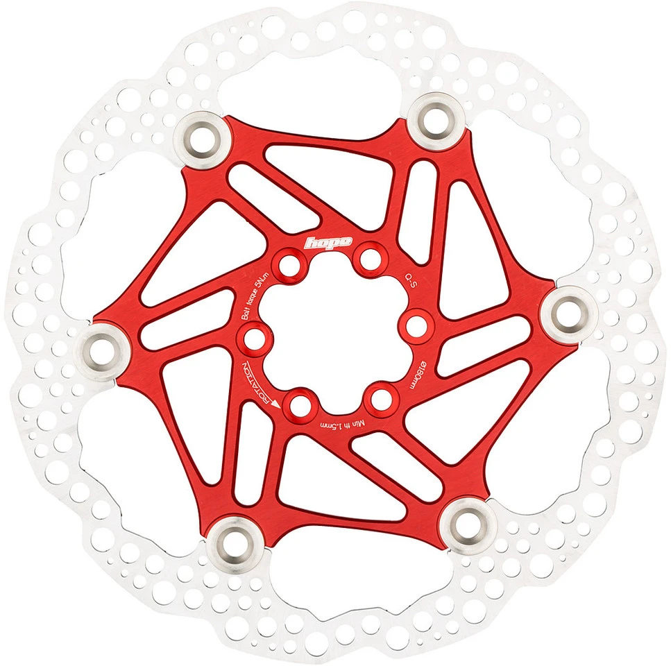 Die Hope Floating Disc ist eine schwimmend gelagerte Bremsscheibe, welche in zahlreichen Durchmessern und Farben erhältlich ist. Das Floating Design besteht aus zwei Teilen, einem Aluminium-Spider, der an der Nabe angebracht ist, und der eigentlichen Bremsscheibe aus Edelstahl, welche in Kontakt zu den Bremsbelägen steht. Wenn die Scheibe sich erhitzt, dann dehnt sie sich aus. Da sie aber nicht starr mit dem Spider verbunden ist, sondern “ schwimmend“ über Nietverbindungen, kann sie sich ganz frei ausdehnen und wieder zusammenziehen, ohne Druck auf den Spider auszuüben. Das beugt einem Verzug der Bremsscheibe vor. Ein weiterer Vorteil der Floating Rotoren ist ihr gegenüber Standard-Bremsscheiben geringeres Gewicht.