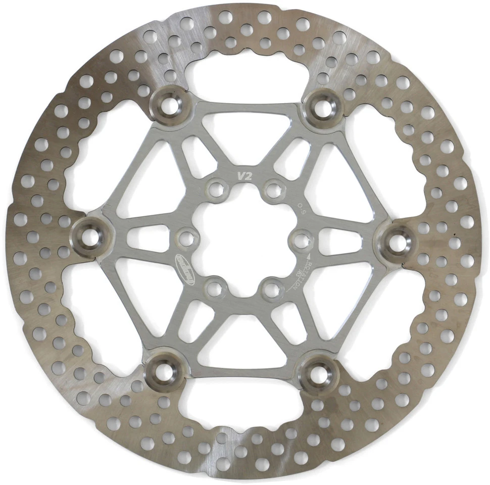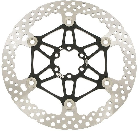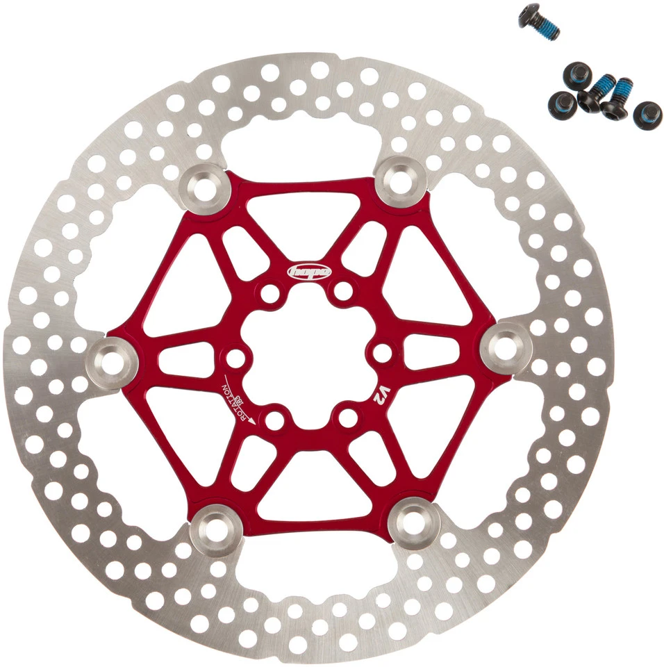 Die Hope MV2 Floating Bremsscheibe ist eine schwimmend gelagerte Bremsscheibe für die Moto FR V2 und Tech V2 Evo Bremse ab Modelljahr 2007. Die schwimmenden Scheiben sind unter Mountainbikern beliebt, da sie die Leistung optimieren und einfach auffallend sind. Die Bremsfläche aus Edelstahl wird an den Aluträger genietet. Diese Konstruktion spart Gewicht und die Scheibe kann sich bei Wärme ausdehnen und zusammenziehen, ohne verformt zu werden.