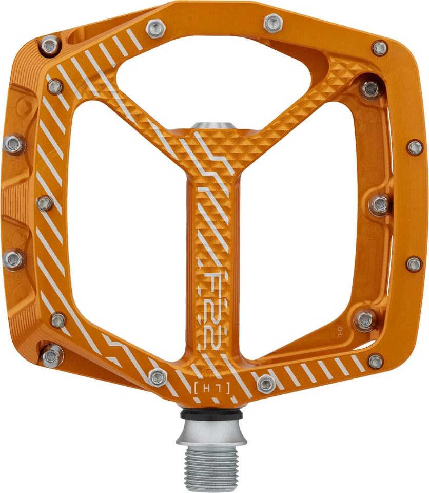 Spezifikationen:Einsatzbereich:All Mountain, Enduro, DownhillAusführung:PlattformpedaleTechnische Daten:Material Pedalkörper:AluminiumMaterial Achse:Stahl (CrMo)Lagerung:ein IGUS-Gleitlager, drei IndustrielagerDichtungen:intern, externBauhöhe:14 mm (Mitte, ohne Pinhöhe), 17 mm (außen, ohne Pinhöhe)Maße (L x B):111 mm x 105 mm (Außenmaß) / 102 mm x 105 mm (Standfläche)Anzahl Pins pro Pedal:22Pinhöhe:4 mm (Mitte), 6 mm (außen)Features:breite Plattformpedale für maximale Stabilität auf dem Mountainbikemit 11 Pins pro Seite für sicheren Haltdank asymmetrischer Form 30 % größere Kontaktfläche als beim Vorgänger F20von allen Seiten zur Mitte hin konkave Standfläche bietet den Füßen sicheren Halt7 Pins pro Seite mit Sechskantaußenprofil, Pinhöhe von 6 auf 5 mm anpassbar mithilfe von Spacernvier 4-mm-Pins (M4) pro Seite in der PedalmitteCNC-gefräster Pedalkörperwiderstandsfähige und langlebige Achse aus CrMo-Stahlvollständig zerlegbarHerstellernummer:PDF22