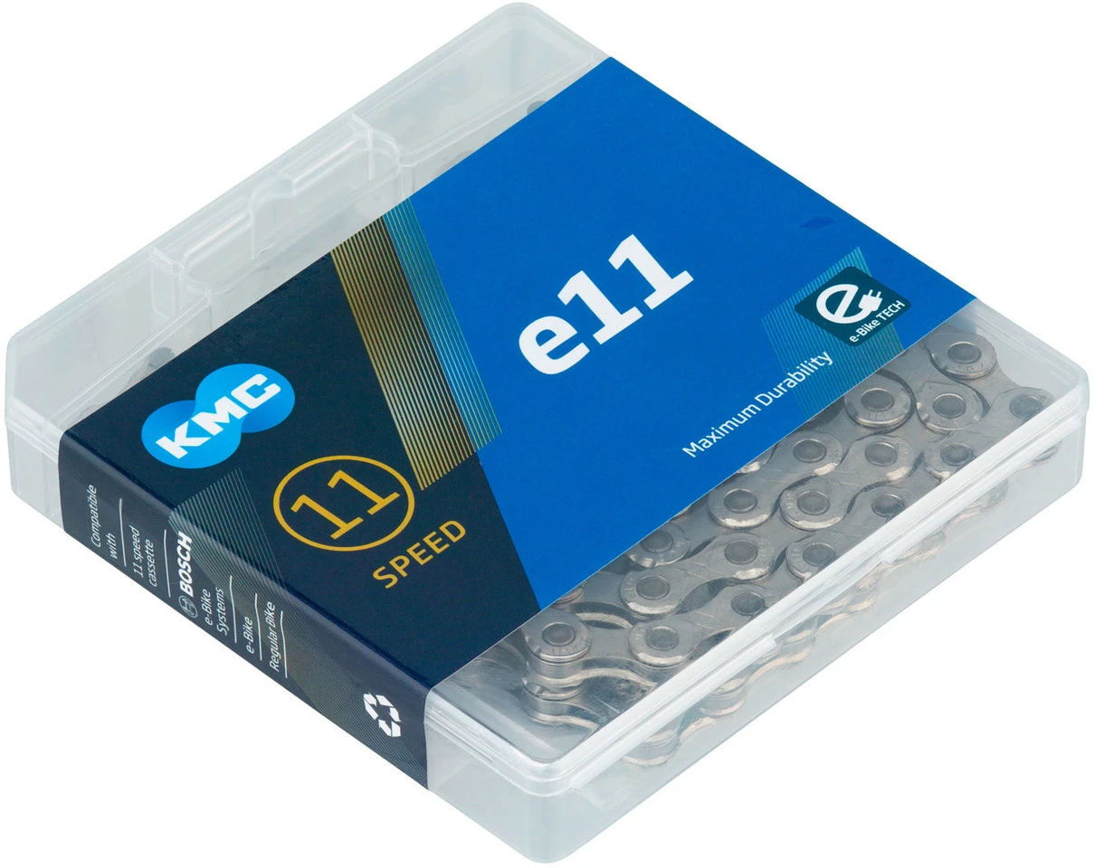 Die KMC e11 Kette überzeugt durch außerordentliche Langlebigkeit. Sie wurde entwickelt für E-Bikes mit Mittelmotoren und 11-fach Antrieb. Neben der hohen Verwindungssteifigkeit gehören auch die verstärkten Nietverbindungen zu den besonderen Features der e11.