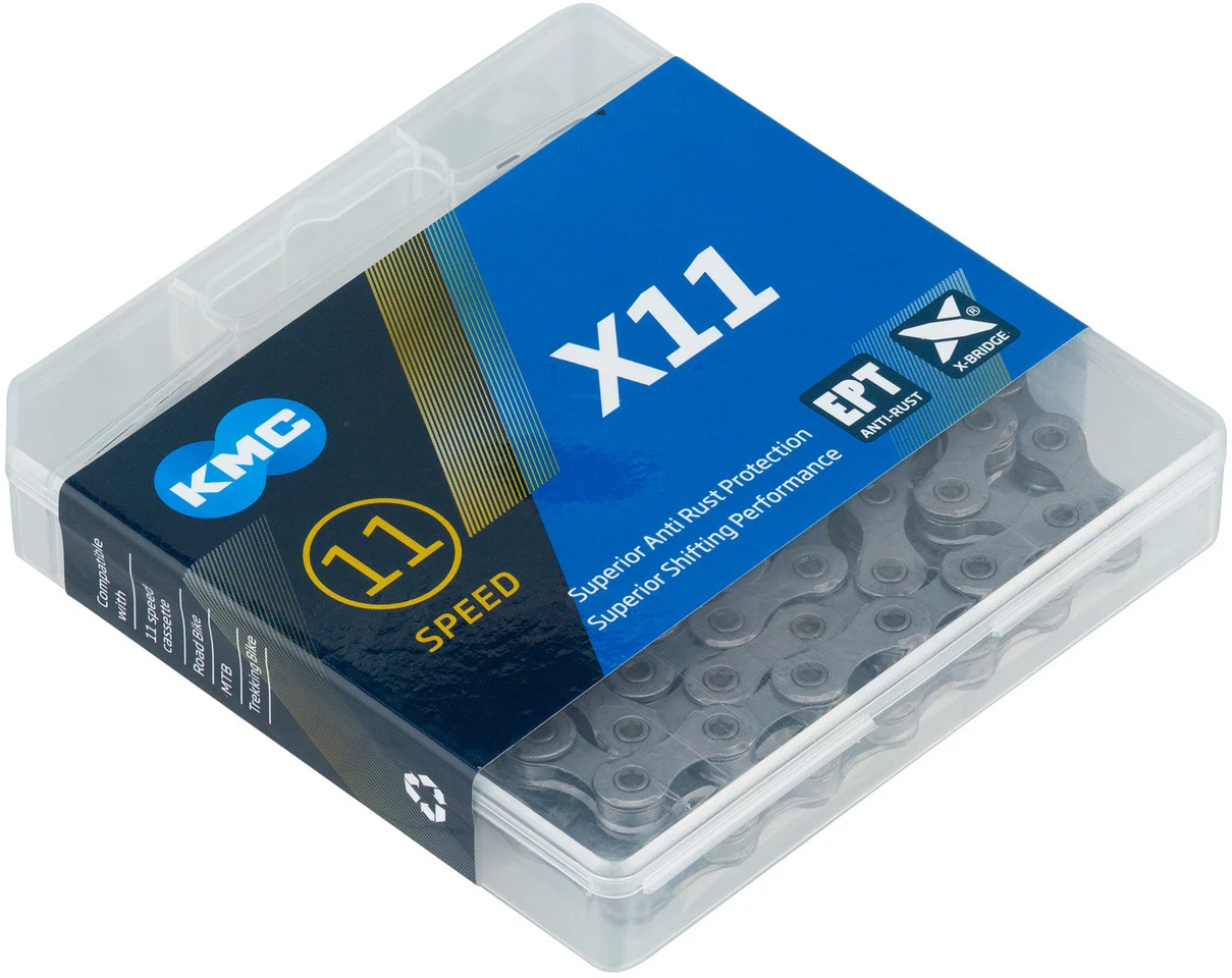 Mit der KMC X11 Kette erhältst Du eine sehr haltbare, nicht laufrichtungsgebundene Kette für Shimano, SRAM und Campagnolo 11-fach Antriebssysteme. Double X Bridge sorgt für besonders hohe Performance. Ein wiederverwendbares Missing Link Kettenschloss wird mitgeliefert.