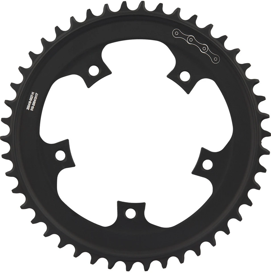 Spezifikationen:Einsatzbereich:RoadBefestigung:110 mm Lochkreis, 5-ArmZähne:46 ZSchaltstufen:1×10-fach, 1×11-fach, 1×12-fachTechnische Daten:Material:Aluminium (7075-T6)Kompatibilität:Trek Domane E-Bikes mit eRoad SpiderSpecialized Turbo Creo E-Bikes mit eRoad SpiderShimano, KMC, SRAM Kettenauch kompatibel mit SRAM AXS Flattop KettenSchaltwerk muss gedämpft sein, z. B. Shimano Shadow Plus, SRAM Type 2Features:M8 Gewindelöchermaschinell hergestellt für herausragende Steifigkeitharteloxiert für Langlebigkeit und SchutzWave Tech Zähneprofil hält die Kette sicher am Platz, wirkt schmutzabweisendHinweis des Herstellers:Auf ruppigem Untergrund oder einfach zur Sicherheit zusätzlich eine obere Kettenführung verwenden.