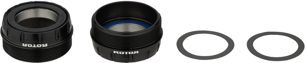 Dieses Innenlager mit Stahl-Lagerung und außenliegenden Lagerschalen erlaubt den Einbau einer Rotor Kurbel mit 30 mm Achsdurchmesser in einen T47-Rahmen mit 68 mm oder 73 mm breitem Tretlager.
