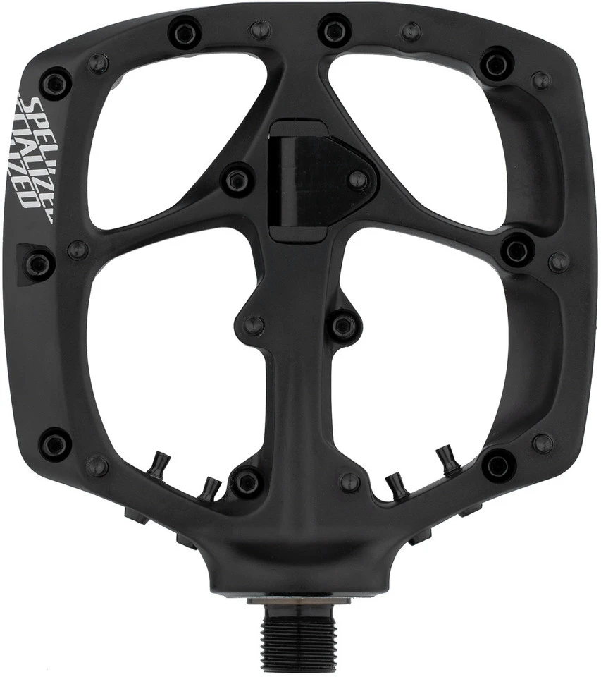 Die Specialized Boomslang Plattformpedale wurden besonders flach gebaut, um im Downhill-Einsatz maximale Bodenfreiheit zu bieten. Zudem sorgen die große Aufstandsfläche, die Spezialpins und die angeschrägten Außenseiten für optimalen Halt des Fußes. Als besonderes Feature wurden je vier Pins in den Pedalkörper so integriert, dass sie unterwegs als Ersatzteile schnell zur Verfügung stehen.