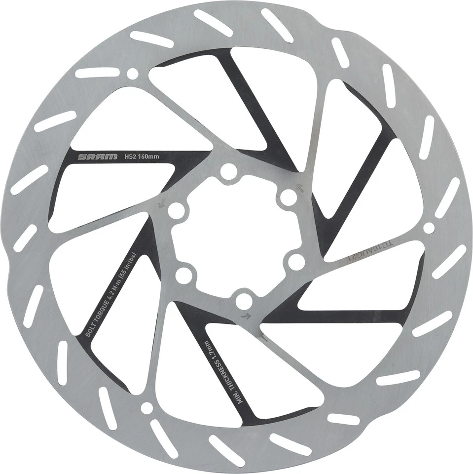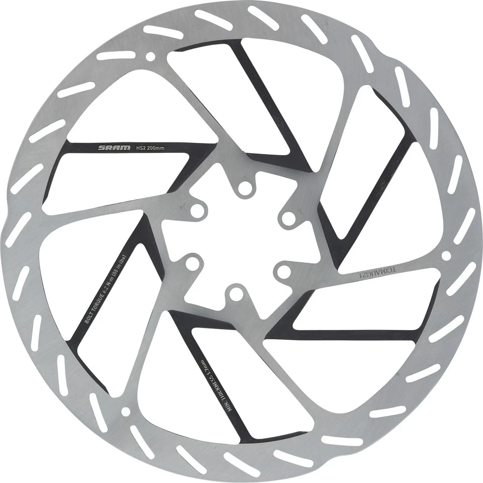 Technische Daten:Montage:6-LochDurchmesser:160 mm, 180 mm, 200 mm, 220 mmBauart:1-teiligMaterial Disc:EdelstahlMaterial Schrauben:StahlFeatures:2 mm dickhohe Wärmeableitung durch speziell beschichtete schwarze Speichenleistungsstark und geräuscharmoptimiertes Profil für hohe Traktion der Bremsbelägefür E-MTBs geeignetHerstellernummern:160 mm:00.5018.176.000180 mm:00.5018.176.001200 mm:00.5018.176.002220 mm:00.5018.176.003Lieferumfang:1 x Bremsscheibe SRAM HS2 6-Loch6 x Schraube SRAM