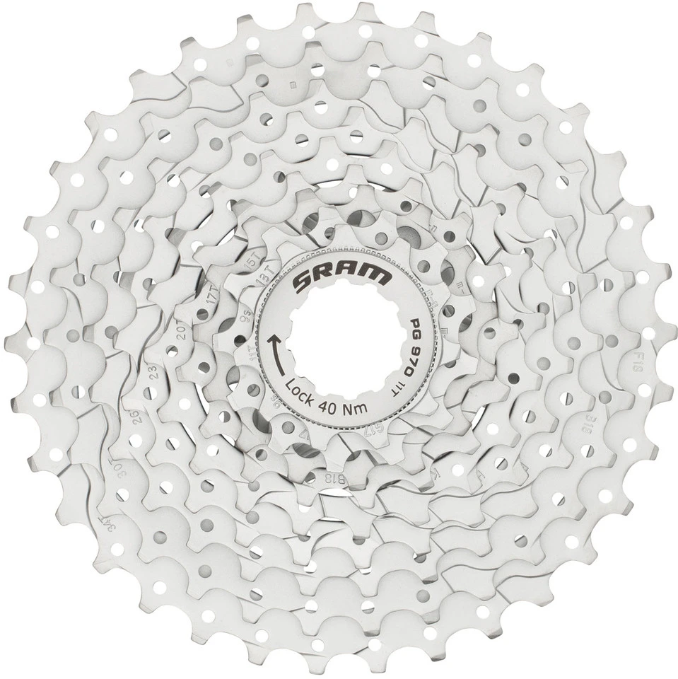 Die PG-970 von SRAM ist eine Kassette mit engem Übersetzungsverhältnis und besonders für alle MTB-Fans geeignet. Die Zahnkränze aus Stahl garantieren eine hohe Festigkeit und Langlebigkeit sowie eine exakte Gangwahl. So ist Dir ein schnelles Rauf- und Runterschalten möglich und Du kommst bei Deinem Ausritt ins Gelände völlig problemlos voran. Die PowerGlide II 9-fach-Kassette ist wahlweise in der Variante 11-32 Z oder 11-34 Z erhältlich.