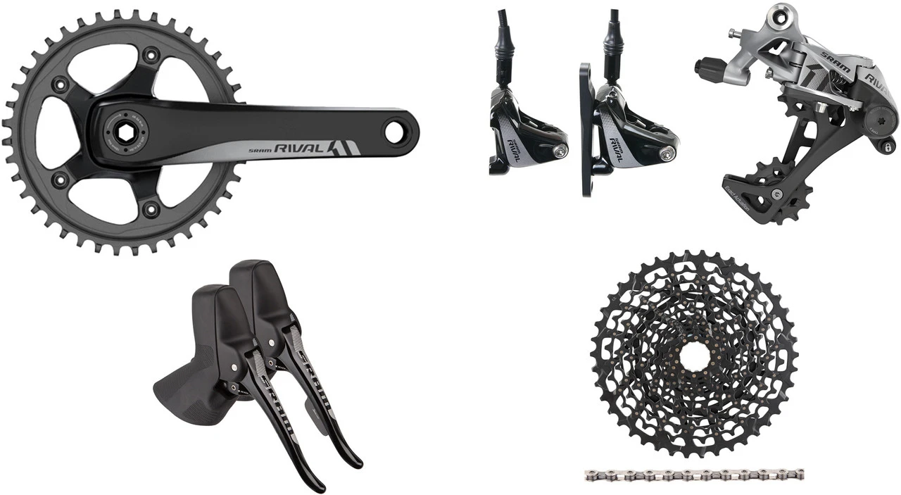 1 x Kurbelgarnitur SRAM Rival 1 BB301 x Kettenblatt SRAM 42 Zähne1 x Schaltwerk SRAM Rival 1 Type 3.0 lang1 x Bremsgriff SRAM Rival 1 1-fach1 x Schalt-/Bremsgriff SRAM Rival 22 DoubleTap® 11-fach1 x Scheibenbremse SRAM Rival 1 (Flat Mount) VR links, montagefertig befüllt und entlüftet1 x Scheibenbremse SRAM Rival 22 (Flat Mount) HR rechts, montagefertig befüllt und entlüftet1 x Kassette SRAM PG-1130 oder XG-1150 (nur bei 10-42 Z)1 x Kette SRAM PC 1130 (114 Glieder)Direkt mitbestellen:Optional erhältliches Zubehör: