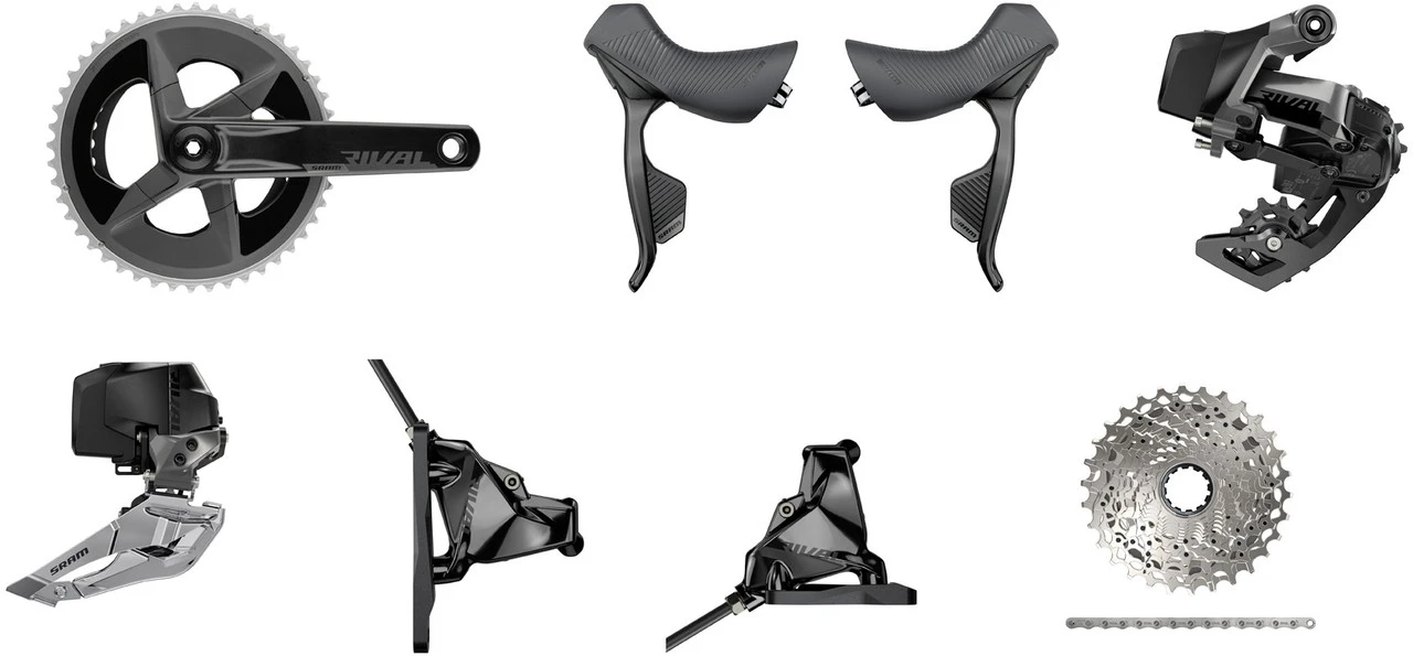 1 x Kurbelgarnitur SRAM Rival DUB 2×12-fach1 x Kassette SRAM XG-12501 x Kette SRAM Rival 12-fach1 x Kettenschloss SRAM PowerLock1 Paar Schalt-/Bremsgriffe SRAM Rival eTap AXS HRD1 Paar Scheibenbremsen SRAM Rival eTap AXS (Flat Mount), montagefertig befüllt und entlüftet2 Paar Bremsbeläge SRAM organisch1 x Bremsleitung SRAM 950 mm (VR)1 x Bremsleitung SRAM 1800 mm (HR)1 x Schaltwerk SRAM Rival eTap AXS1 x Umwerfer SRAM Rival eTap AXS2 x Akku SRAM eTap / AXS1 x Akkuladegerät SRAM1 x Befestigungsschraube SRAM für Umwerfer1 x Unterlegscheibe SRAM für Umwerfer3 x Adapterkeil SRAM für Umwerfer1 x Schraube für Umwerfer2 x Transportsicherung SRAM2 x Entlüftungsblock SRAM Bleed Block2 x S-Haken Jagwire2 x Insertpin2 x Olive1 x Torx-Schlüssel T81 x Einstelllehre SRAM Chain Gap Adjustment Gauge