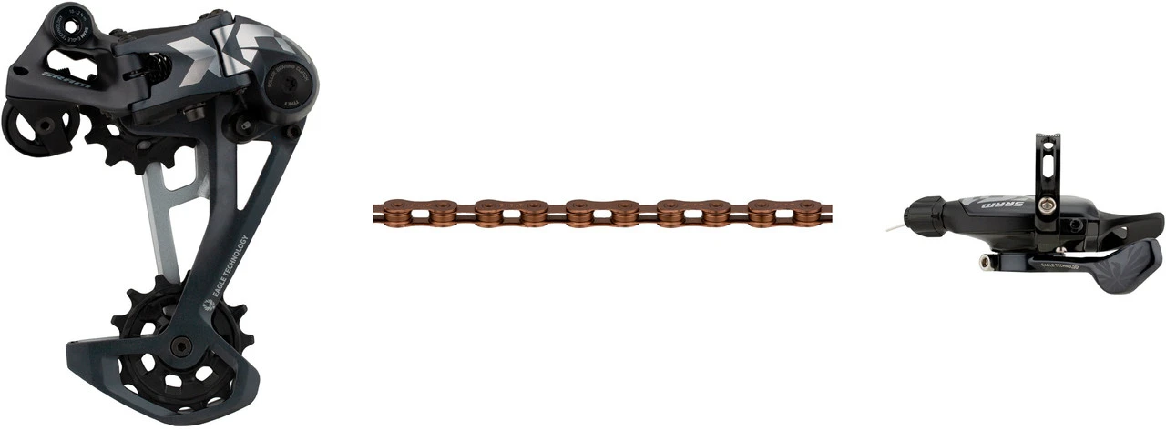 Schaltwerk:lunar (dunkelgrau)Schaltgriff:lunar (dunkelgrau)Kette:nach Wahl XX1 rainbow (bunt), XX1 copper (kupferrot), XX1 gold, XX1 black, X01 silverHerstellernummern:Schaltwerk: 00.7518.138.001Schaltgriff: 00.7018.434.001Kette: 00.2518.039.010 (XX1 rainbow), 00.2518.043.010 (XX1 copper), 00.2518.024.020 (XX1 gold), 00.2518.024.021 (XX1 black), 00.2518.023.011 (X01 silver)Lieferumfang:1 x Schaltwerk SRAM X01 Eagle1 x Schaltgriff SRAM Trigger X01 Eagle Single Click 12-fach1 x Kette SRAM PC XX1 Eagle oder PC X01 Eagle (nur X01 silver)1 x Kettenschloss SRAM PowerLock1 x Klemmschelle SRAM1 x Schaltzug SRAM 2200 mm1 x Einstelllehre SRAM Chain Gap Adjustment GaugeDirekt mitbestellen:Schaltzugaußenhülle