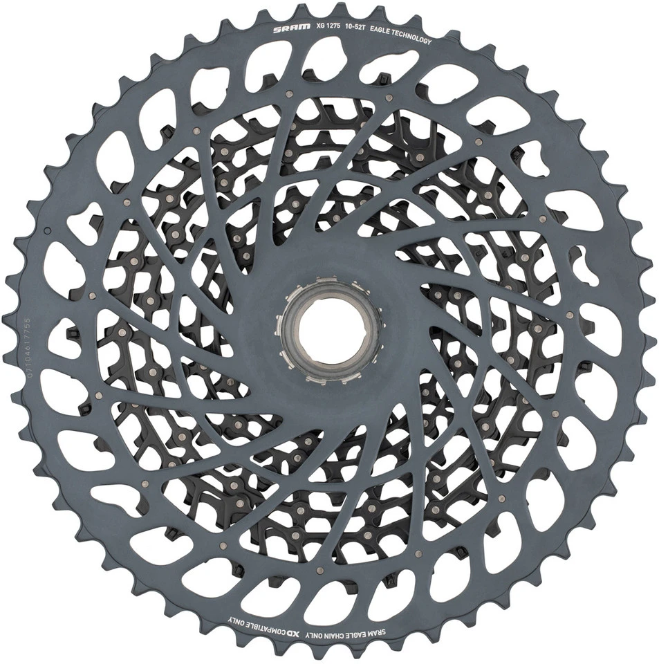 Die SRAM XG-1275 Kassette für GX Eagle bietet zwölf Schaltstufen für Fahrer, die Wert auf Zuverlässigkeit und Haltbarkeit legen. In dem offenen Design haben Schlamm und Dreck keine Chance, sich zwischen den Ritzeln festzusetzen. Die FULL-PIN™-Technologie, die präzise gefertigte Stahlritzel mittels hochfester Edelstahlstifte verbindet, ergibt eine leichte, robuste Kassette mit guter Selbstreinigung, reibungslosem Schalten und hoher Haltbarkeit. Mit 10-52 Zähnen erhältst Du eine riesige Bandbreite, die auch an härtesten Anstiegen den richtigen Gang für Dich bereithält. Oder möchtest Du auf ein größeres Kettenblatt umsteigen und so höhere Geschwindigkeiten erreichen, ohne Dich bei der Kletterfähigkeit einzuschränken? Du hast alle Möglichkeiten!
