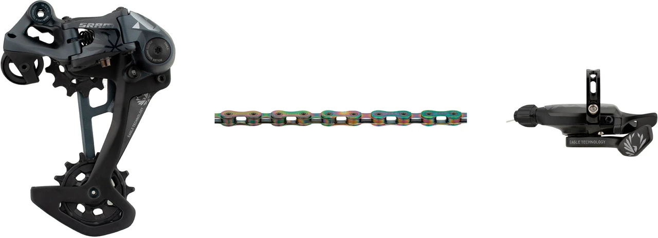 Schaltwerk:lunar (dunkelgrau)Schaltgriff:lunar (dunkelgrau)Kette:nach Wahl XX1 rainbow (bunt), XX1 copper (kupferrot), XX1 gold, XX1 blackHerstellernummern:Schaltwerk: 00.7518.139.000Schaltgriff: 00.7018.436.000Kette: 00.2518.039.010 (XX1 rainbow), 00.2518.043.010 (XX1 copper), 00.2518.024.020 (XX1 gold), 00.2518.024.021 (XX1 black)Lieferumfang:1 x Schaltwerk SRAM XX1 Eagle1 x Schaltgriff SRAM Trigger XX1 Eagle Single Click 12-fach1 x Kette SRAM PC XX1 Eagle1 x Kettenschloss SRAM PowerLock1 x Klemmschelle SRAM1 x Schaltzug SRAM 2200 mm1 x Einstelllehre SRAM Chain Gap Adjustment GaugeDirekt mitbestellen:Schaltzugaußenhülle