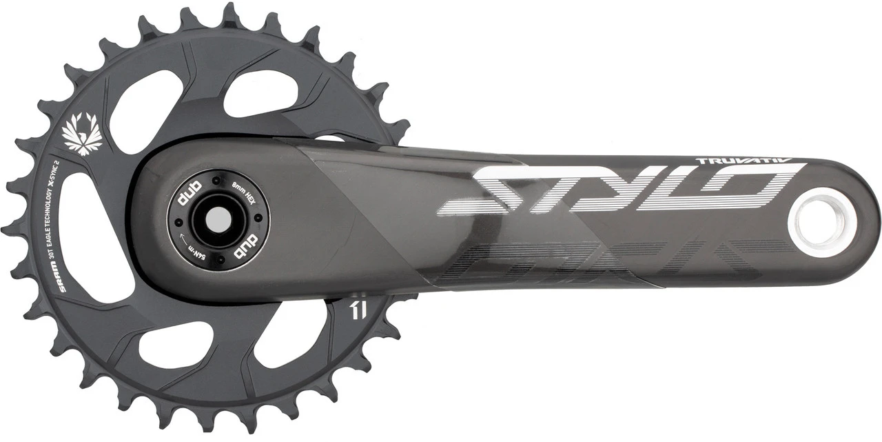 Kurbelarmlänge: 175,0 mmHerstellernummer: 00.6118.528.004Lieferumfang:1 x Kurbelgarnitur Truvativ Stylo 6K Eagle Fat4 Direct Mount DUB1 x Kettenblatt SRAM 30 Zähneohne DUB-Innenlager